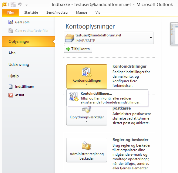 13. De næste indstillinger er skal sikre at dine mails gemmes de de rigtige foldere mm. Klik på filer og kontoindstillinger.