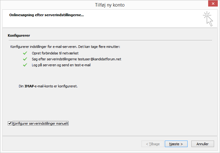 Sæt flueben i Konfigurer serverindstillinger manuelt, lige meget hvordan det går for at sætte de sidste ting op. Og vælg næste.