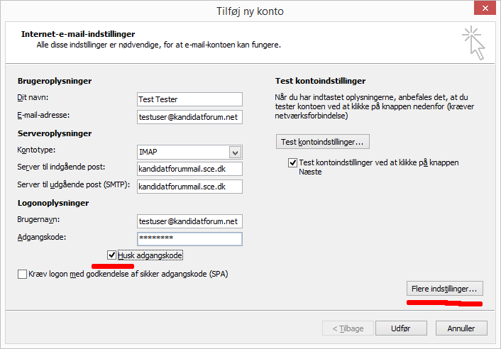 9. Vælg Ok, så er du tilbage ved Internet e-mail indstillinger og vælg udfør. Fjern evt. flueben i Test kontoindstillinger. Vælg herefter Udfør.