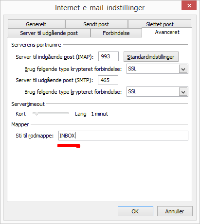 7. Vælg fanen Avanceret og angiv Sti til rodmappe til INBOX